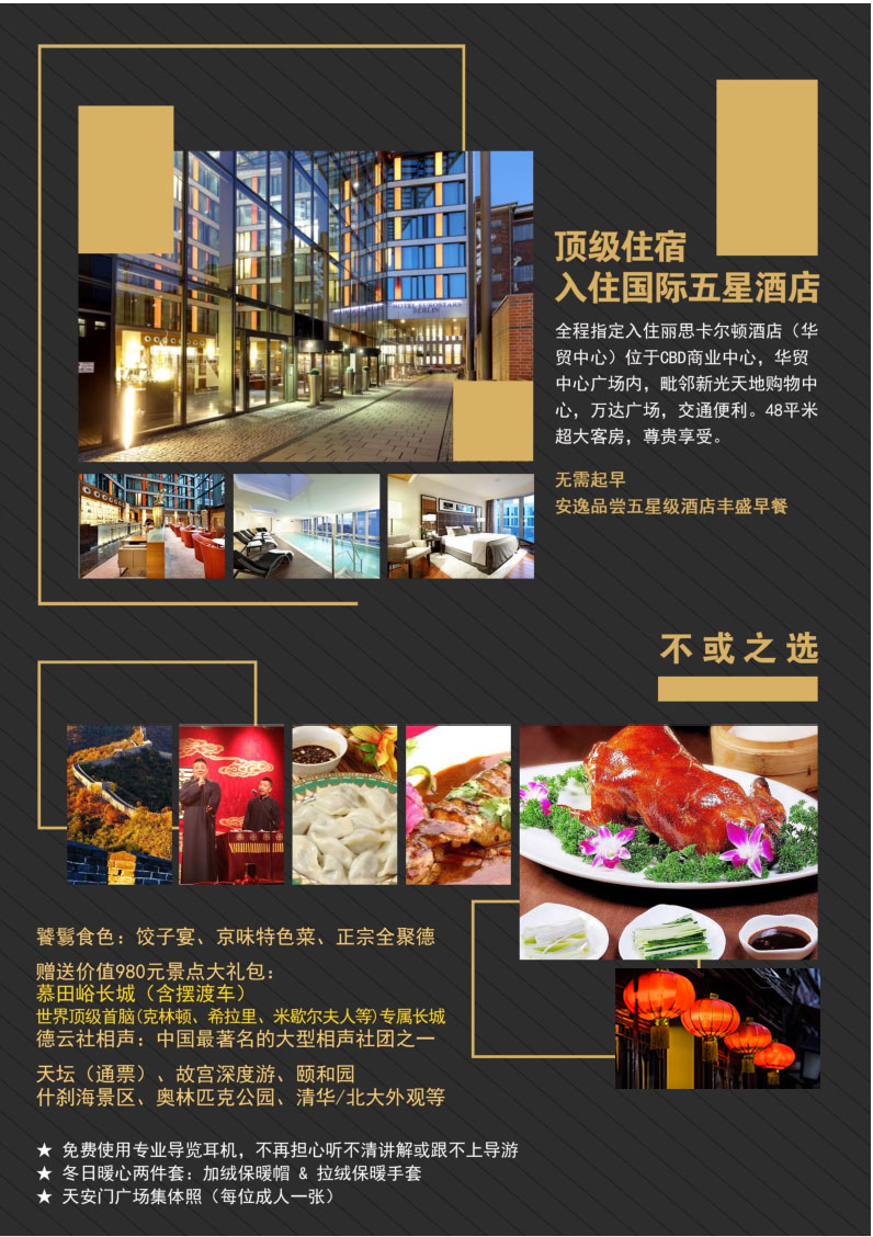 2、行程取名【至尊五星】是为了方便推广,北京接待时也可能使用其他名称,但是接待内容一致,请知悉!