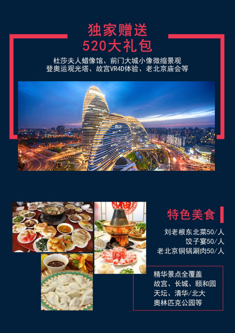 价值 180 元/人的杜莎蜡像馆大门票、价值 140/人的大城小像大门票、价值 40/人的 VR4D 紫禁城体验大门票、价值160/人的奥运观光塔大门票。