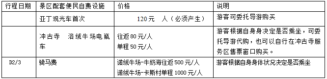 1、亚丁景区观光车120元/人(必须产生),冲古寺到洛绒牛场电瓶车费往返80元/人,单程50元/人;洛绒牛场到牛奶海马费500元/人起,