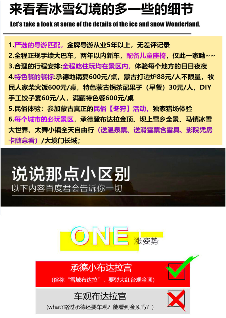 C、冬季坝上雪量,以及雪景观好坏属于自然气候现象,无法人为操控,如观赏效果不佳,请见谅,不接受观赏效果好坏作为活动好坏的评判以及投诉原因等要求。 活动中所有景点及费用由于参加者自身原因放弃或者不可抗力因素导致无法正常游览,费用不退。