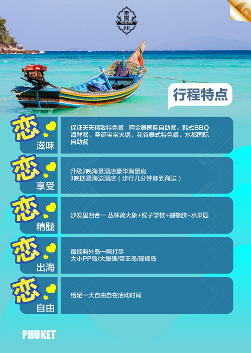 漫步于银白色的沙滩上享受无尽的热带风光。这可能就是所谓的偷得浮生半日闲的意境吧! 指定时间集合 随后前往普吉机