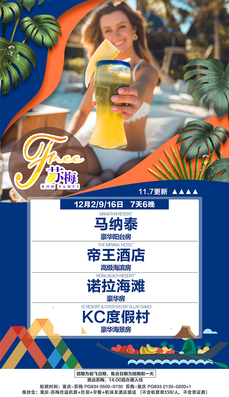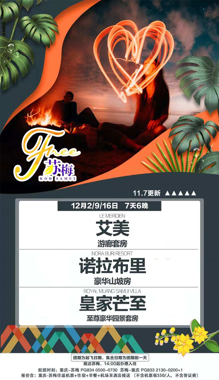 轻松愉快:曼航重庆直飞苏梅岛花园机场,免去舟车劳顿,节省更多时间,更轻松。